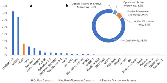 Remote sensing (a) sensors and (b) sensor types utilized in the studies for tree mortality monitoring.