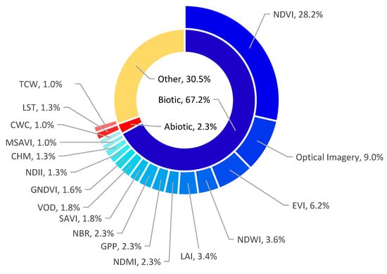 The Normalized Difference Water Index (NDWI) is another less frequently used indicator, used in nearly 4% of the studies; this indicator aims at monitoring the structure and biomass of trees affected by drought [30,43,44]. Noticeably, the Leaf Area Index (LAI) ranked in fifth place with 3.4% of the studies; 2.3% of the studies involve the Normalized Difference Moisture Index (NDMI), Gross Primary Production (GPP), and Normalized Burn Ratio (NBR). LAI takes into account plant or canopy water content [45,46] and is useful in estimating forest density and mortality [47,48]. The remaining indicators are used in less than 2.3% of the literature reviewed.