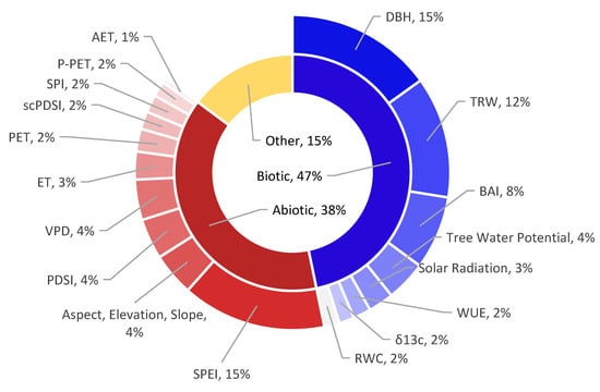 Abiotic indicators have an essential role in the analysis and characterization of tree mortality. As shown in Figure 9, the majority of studies utilize the meteorological drought indicator SPEI in roughly 15% of the cases. SPEI is a useful indicator in dry regions with high temperatures suffering from water losses through evapotranspiration [53]. The SPEI and SPI indicators are generally similar, with their basic difference being that SPI does not include temperature [54]. Topographic factors, such as PDSI and vapor pressure deficit (VPD), were represented in 4% of the cases. PDSI can monitor the influence on tree growth by assessing the combined effects of both temperature and precipitation [55], while VPD, as an indicator to monitor plant water stress, is linked to stomatal water loss and carbon fixation during photosynthesis [56,57]. Lastly, indicators such as PET, SPI, ET, scPDSI, P-PET, and AET are used in less than 4% of studies each.