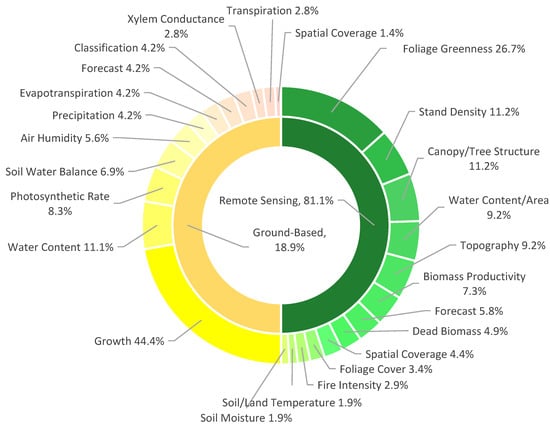The reviewed works were categorized on the basis of two methodological approaches: “remote sensing” and “meteorological ground-based”. We classified 254 publications using these two methods and, further on, into specific subgroups (Figure 11). Some research publications focused on two or three types of methods/indicators/research focus. For instance, in the remote sensing methods classification, the water response of trees related to stem and leaves moisture content is monitored through NDWI, Vegetation Optical Depth (VOD), Normalized Difference Infrared Index (NDII), Canopy Water Content (CWC), Relative Water Content (RWC), and Normalized Difference Moisture Index (NDMI) [59], thus categorized within the Water Content group. For the comprehensive list of all indicators used in this article, the reader is referred to Supplementary Materials S3.