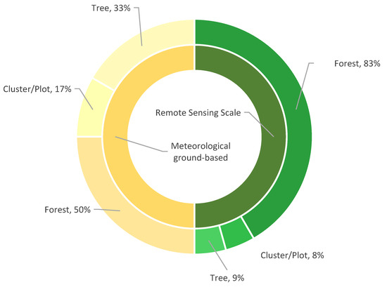 On the one hand, it was noted that 83% of the remote sensing studies focus on the forest scale. In certain instances, detailed observation of mortality is feasible using sensors like LiDAR and UAVs, but for short time series. Cluster or forest plot monitoring was performed in 8% of reviewed articles, while individual tree monitoring in 9%. On the other hand, 33% of papers using meteorological ground-based monitoring focused on individual tree mortality, as such methods could provide more accurate individual tree mortality analysis compared to the cluster or plot scale (this approach comprised 17% of the studies). Forest-scale monitoring was observed in half of meteorological ground-based studies (Figure 12).