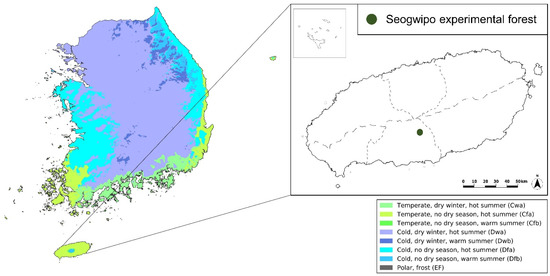 This study was conducted in a Seogwipo experimental forest located on Jeju Island, South Korea. The Seogwipo experimental forest spans an altitude of 400 to 1000 m in the central mountainous region near the base of Hallasan Mountain, covering approximately 1550.4 hectares. The forest has a humid subtropical climate (Cfa) with gentle winters and fairly consistent rainfall. The study site is positioned at a height of 550–600 m above sea level. The forest is an 80-year-old, artificially planted, monospecific forest of Chamaecyparis obtuse. Forest thinning operations were carried out in December 2021, and there are currently around 400 trees per hectare. The coordinates of the study site are 33°18′28″ N, 126°32′50″ E (Figure 1). Furthermore, the forested area is far from major roadways and industrial developments, minimizing external pollution influence.