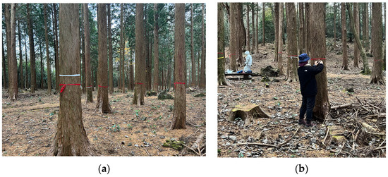 We conducted a thorough examination of the forest to gather data about the research location. The NVOC measurement point and forest survey point were established in 30 m × 65 m quadrants with the forest roads as the boundary. The forest survey items comprised tree species, tree location, crown spread width in four directions, diameter at breast height (DBH), bole height, tree canopy openness, and tree spacing. The inter-tree spacing was calculated using the coordinates of the tree locations. The crown cross-sectional area was calculated based on the crown spread width in four directions. A total of 88 trees were surveyed. Figure 2 displays the forest environment of the study site. Table 1 shows an investigation of the forest environment of the study site.