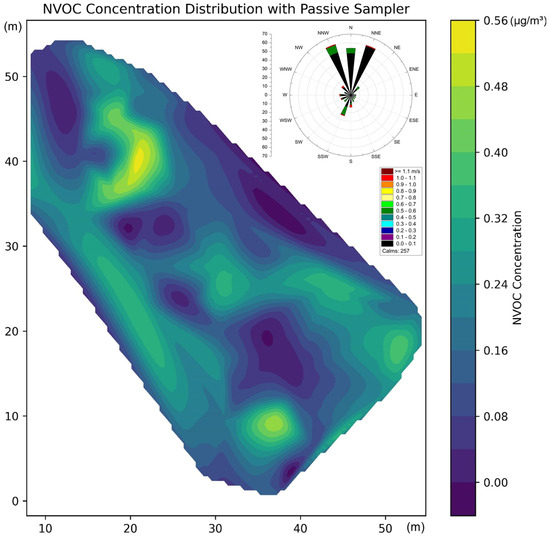 Based on the NVOC concentration detected by the passive sampler, we derived the NVOC concentration distribution map (Figure 3). The tree locations are shown as white dots in the lower left corner of Figure 3. The mean NVOC concentration was 0.1858 μg/m3 with a standard deviation of 0.1173 μg/m3. The maximum and minimum values were 0.47 and 0.01 µg/m3, respectively (Table 1).
