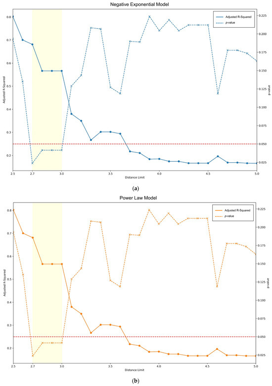 Table 6 shows the analysis results of the three distance decay models across various tree spacing limits. Figure 4 depicts the graphical results of the model. Across the three distance decay models examined, a consistent pattern emerged when the distance limits between trees varied. In Figure 4, p-values are shown as dashed lines, and a red dashed line corresponding to a p-value of 0.05 has been added to help identify statistical significance. The corresponding range is highlighted in yellow. When the tree spacing was restricted to 2.7–3 m, the statistical significance of the models was confirmed (p < 0.05). The model fit, the adjusted R-squared value, is displayed as a solid line, which indicates how well the model fits the data across different distance limits. The results of this analysis followed a typical pattern, peaking at a certain point and decreasing with an increase in the distance limit. The range 2.7–3 m exhibited statistical significance and a good model fit, suggesting that the impact of tree spacing on NVOC concentrations was most pronounced within this specific range.