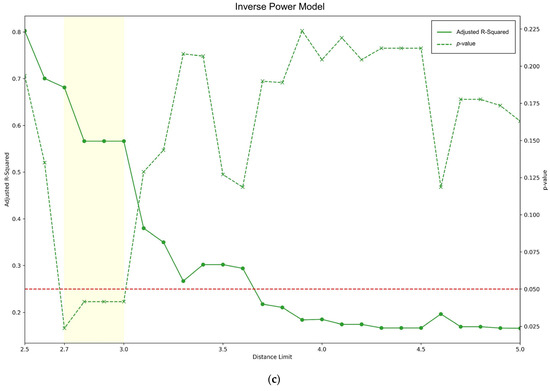 Distance decay model analysis with tree spacing limits: (a) negative exponential model; (b) power law model; (c) inverse power model.