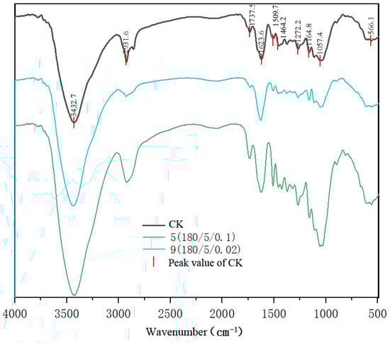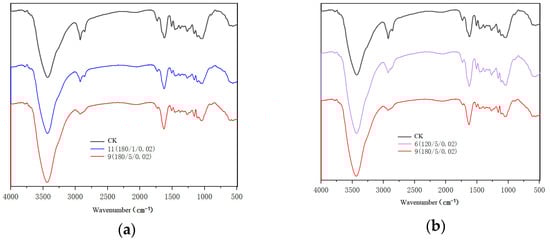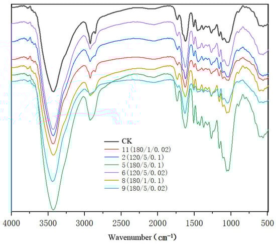 As illustrated in Figure 2, Figure 3 and Figure 4, 3431 cm−1 is the O-H group stretching vibration peak, and the absorption peak here was enhanced with negative pressure and temperature increases in the range of 120–180 °C during intermediate temperature heat treatment. This mainly occurred via changes in the internal structure of the material in relation to the heat treatment and the increase in the crystallinity of the wood fibers []. Essentially, all cellulose hydroxyl groups function as hydrogen bonds. The increase in crystallinity was attributed to the formation of strong hydrogen bonds, resulting in a more ordered fiber structure and the absence of free hydroxyl groups in cellulose, either crystalline or amorphous cellulose. In the spectrogram, 2925 cm−1 characterizes the strength of the stretching vibrations of C-H in methyl and methylene groups. This indicates that when the polysaccharides in hemicelluloses were thermally decomposed, the number of groups decreased; therefore, the absorption peaks diminished with increasing temperature and time, which agrees with the findings of Liang et al. based on poplar hemicelluloses []. The intermolecular interaction forces in hemicelluloses were enhanced at higher pressures, which may have slightly enhanced the lightness of the methyl group peaks; this result is consistent with that of Chang et al. in relation to interactions between cellulose at high pressures [,]. In the spectrum, 1732 cm−1 is mainly the C=O bond stretching vibration peak, and it represents the xylan in hemicelluloses, as well as the acetyl, carboxyl, and alcohols in lignin, and the peak value of the absorption peaks at this time does not change much, which may be due to the oxidative decomposition of some unstable compounds caused by the elevated temperature of the heat treatment and the reduction of the carbonyl group and the content of the other groups [].