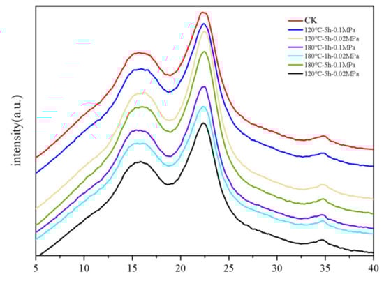Treated wood specimens with a vacuum negative pressure of 0.1 MPa at 180 °C and 120 °C for 5 h and at 180 °C for 1 h and treated wood specimens with a vacuum negative pressure of 0.02 MPa at 180 °C and 120 °C for 5 h, and at 180 °C for 1 h and untreated wood specimens were selected. They were then cut into small pieces and ground into wood powder to a particle mesh size between 80 and 100 using a mill. The samples were oven-dried at a temperature of (103 ± 2) °C. To analyze the effect of superheated steam treatment on the crystalline structure of cellulose, the powder was examined with an X-ray diffractometer (X’ Pert PRO-30X; Philips, Amsterdam, The Netherlands)) with Cu Kα radiation (λ = 0.154 nm). The XRD pattern was determined using the following parameters: a scanning range of 5°–40°; a voltage of 40 kV; and a scan rate of 2°/min. The crystallinity index (CrI) of each specimen was calculated according to the Segal method [], as follows: