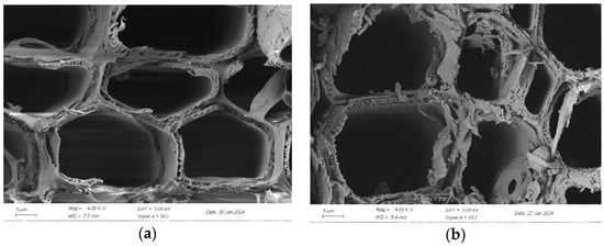 This change reflects a significant increase in the vapor pressure within the wood, owing to the conversion of internal moisture to vapor during heat treatment. When the vapor pressure exceeded the structural stability of the cell walls composed of cellulose and lignin in wood, the cell walls ruptured, and the connections between the original fibers broke, resulting in cracks. These cracks may also have been caused by the high vapor pressure generated by the resistance to moisture movement when the wood was heated, as the stomata of such wood were clogged with gum and methylcellulose. This further restricted the escape of moisture, thus exacerbating the internal pressure [].