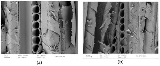 SEM images of cross-section of C. funebris wood after heat treatment at (a) 150 °C and (b) 180 °C.