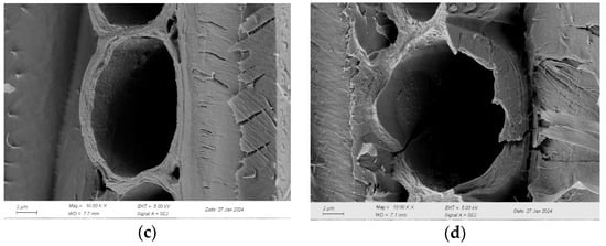 SEM images of tangential section of C. funebris wood after heat treatment (a,c) 150 °C and (b,d) 180 °C.