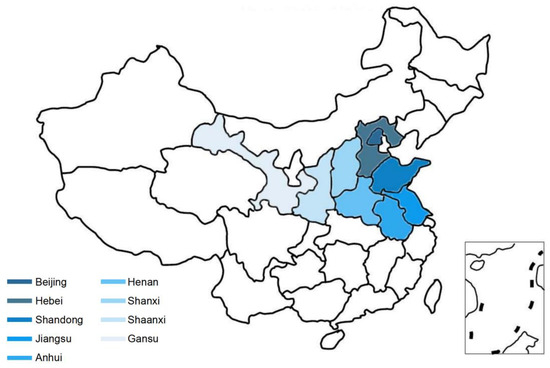 Locations in the northern region of China of the nine sample populations (Beijing, Hebei, Shandong, Jiangsu, Anhui, Henan, Shanxi, Shaanxi, and Gansu) are shown in different colors, including the best single-plant areas.