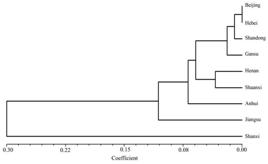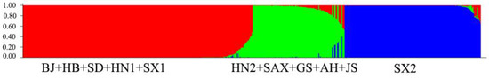 We excluded the Gansu, Anhui, and Jiangsu collections from the population diversity analysis owing to the small number of samples. Consequently, our estimates for them may not be representative. Based on the results of the population genetic diversity analysis (Table 3), the BJ population had relatively low genetic diversity (Na = 2.692, Ne = 1.699, I = 0.562, Ho = 0.474, He = 0.329). We converted the I values of various groups to the effective number of species as follows: 1.8 (BJ), 2.0(HB), 2.2 (SD), 2.9 (HN), 3.5 (SX), 3.1 (SAX). Hence, we can state that the SX population has a relatively high diversity.