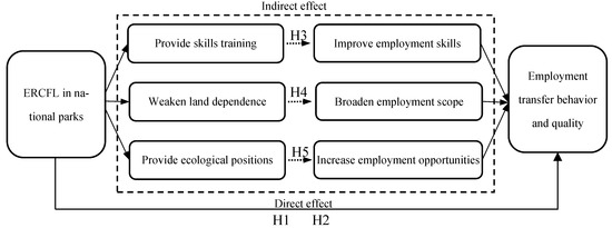 According to labor migration theory, labor transfer employment is affected by multiple factors, and institutional reform is an important factor [14]. The ERCFL in national parks has both direct and indirect effects on the employment transfer behavior and employment quality of forest farmers, as shown in Figure 1. The following impact will be analyzed below in terms of two aspects: direct and indirect impact.