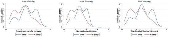 According to Equations (2) and (3), the samples are matched first, and then the DID model is used to estimate the result. After the propensity score was calculated, a density function graph was further drawn to test the matched common support domain and thus ensure the matching quality, as shown in Figure 3. The figure shows that the propensity scores of the matched sample participating in easement reform and the non-participating sample have a large range of overlap, and most of the observed values are within the common value range. Table 4 shows the balance test of covariates. The pseudo R2, LR statistics, and standardized deviation values all decreased after matching, indicating that the propensity score matching method can effectively reduce the difference in the distribution of explanatory variables between the control group and the treatment group and eliminate estimation bias due to sample selection.