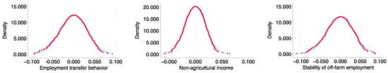 In Equations (4) and (5), is the mediator variables, including improving non-agricultural employment skills, broadening the scope of non-agricultural employment, and increasing non-agricultural employment opportunities. and are the parameters to be estimated, and the meanings of other variables are the same as in Equation (1).