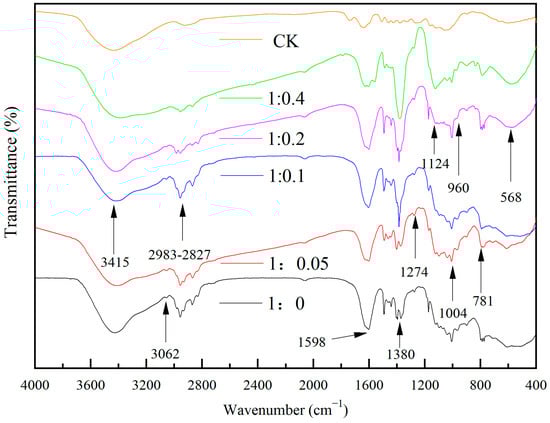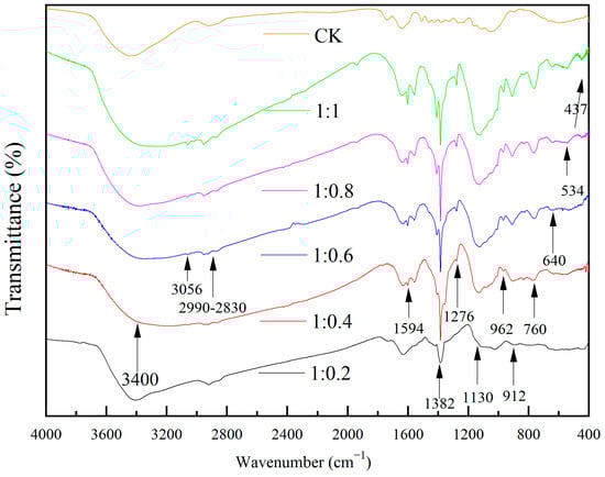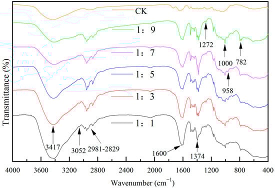 The infrared spectra of wood specimens with different molar ratios of TBOT to EtOH are shown in Figure 2. The modified specimen exhibited a new peak compared to CK, as depicted in the figure. The broad peak near 3417 cm−1 corresponded to the stretching vibration of -OH groups originating from wood cellulose and generated through the hydrolysis of TBOT and VETS during the reaction process. Notably, the intensity of this vibrational peak decreased with increasing ethanol dosage. The peaks observed within the range of 2981 cm−1–2829 cm−1 represented stretching vibrations of C-H bonds in -CH3 and -CH2-, which could be attributed to cellulose, TBOT, as well as EtOH. Additionally, these peaks might arise from cellulose and incompletely hydrolyzed residues present in TBOT and VETS. The peak around 1600 cm−1 likely indicated a stretching vibration associated with C=C bonds, while the vibrational band near 3052 cm−1 suggested a stretching vibration related to C-H bonds in -CH=CH2 groups. Furthermore, the vibrational feature near 1272 cm−1 may represent a bending vibration of C-H bonds in -CH=CH2 moieties. By considering these three vibrational bands at 1600 cm−1, 3052 cm−1, and 1272 cm−1 collectively, it can be hypothesized that -CH=CH2 groups from VTES were successfully immobilized onto the wood surface. Moreover, the sharp peak centered around 1374 cm−1 was assigned to telescopic vibrations arising from -NO3 [], whereas another band near 1000 cm−1 may correspond to asymmetric telescopic vibrations associated with Si-O-Si linkages [,,]. Additionally, the peak at approximately 958 cm−1 suggests Ti-O-Si vibrations while another absorption band at around 782 cm−1 corresponds to Ti-O-Ti vibrations. Considering these three vibrational features located at approximately 1000 cm−1, 958 cm−1, and 782 cm−1, respectively, it can be inferred that both TiO2 and SiO2 were successfully loaded onto the wood surface forming bonded structures such as Ti-O-Si.