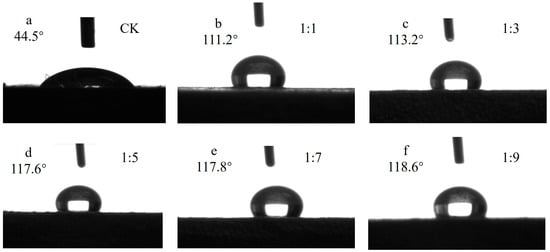 The contact angles of Si-Ti composite films prepared with different molar ratios of TBOT to EtOH are presented in Figure 4. It is evident from the figure that the modified test materials exhibited significantly increased contact angles, all above 110°, indicating a transition from hydrophilic to hydrophobic wettability on the modified wood surface. Within the range of n(TBOT) to n(EtOH) ratio between 1:1 and 1:9, it was observed that the contact angle tended to increase with higher ethanol dosage, reaching a maximum value of 118.6°. However, this increase was relatively small, with a marginal difference of only 6.5°. Ethanol played a crucial role as a re-reaction solvent and facilitated solute dispersion. Inadequate ethanol content resulted in non-uniform dispersion of TBOT and VTES, while excessive ethanol prolonged solute formation time due to its inhibitory effect on VTES silane hydrolysis as it is one of its hydrolysis products. Therefore, an optimal amount of ethanol proved beneficial for promoting the reaction process.
