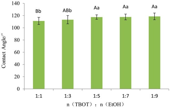 In order to investigate the impact of TBOT on the wettability of Si-Ti composite films on wood surfaces, an analysis of variance (ANOVA) was conducted for different levels of molar ratio between TBOT and EtOH. The results are presented in Table 2. Based on the significance level values provided in the table, it is evident that the molar ratio of TBOT to EtOH has a highly significant effect on the wettability of Si-Ti composite films on wood surfaces. Subsequently, Fisher’s least significant difference (LSD) test was performed to compare the extent of variation among different levels, and these outcomes are illustrated in Figure 5. According to multiple comparisons using Fisher LSD test, there exists a highly significant difference between n(TBOT)/n(EtOH) ratios at 1:1 and those at 1:5, 1:7, and 1:9; meanwhile, a significant difference can be observed between n(TBOT)/n(EtOH) ratios at 1:3 and those at 1:5, 1:7, and 1:9. No differences were detected among other levels.