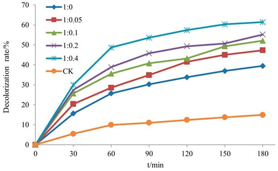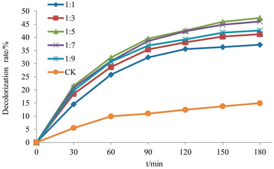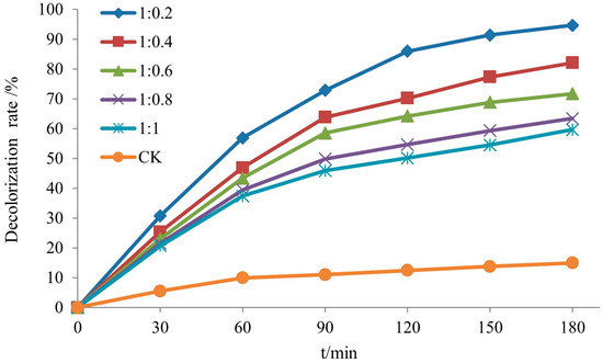 Figure 6 illustrates the decolorization curves of rhodamine B on a Si-Ti composite membrane over time under varying molar ratios of TBOT to EtOH. From the figure, it is evident that the decolorization of rhodamine B on the Si-Ti composite membrane initially increased and then decreased with an increase in ethanol dosage. The highest decolorization rate observed was 47.4% when the molar ratio of TBOT to EtOH was 1:5. XRD results indicated that TiO2 loaded onto the wood surface did not crystallize under these reaction conditions, which primarily accounted for its low phase catalytic activity. The ethanol dosage influenced both the hydrolysis reaction rate and cross-linking of hydrolyzed monomers. When ethanol dosage was low, rapid hydrolysis increased chances of cross-linking among hydrolyzed monomers, accelerating polymerization reactions and facilitating agglomeration of TiO2 particles generated by this process. Conversely, higher ethanol dosages resulted in slower rates for both hydrolysis and polymerization reactions, leading to reduced TiO2 particle size and subsequently affecting its photocatalytic activity [].