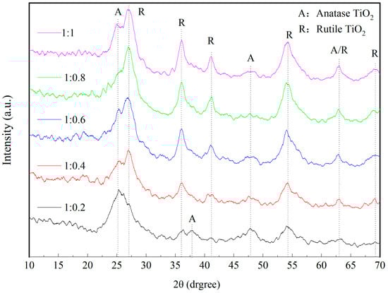 Figure 8 shows the XRD patterns of wood specimens with different molar ratios of TBOT to VTES. From the figure, it can be seen that the crystalline structure of TiO2 in the Si-Ti composite film on the surface of wood was mainly anatase when the ratio of n(TBOT) to n(VETS) was 1:0.2. With the increase in the dosage of VTES, the crystalline structure of TiO2 was gradually changed from anatase to rutile, and it was hypothesized that SiO2 promoted the transformation of TiO2 from anatase to rutile. The relative content of these two phases can be calculated from the quantitative formula [] (2), and the results are shown in Table 3.