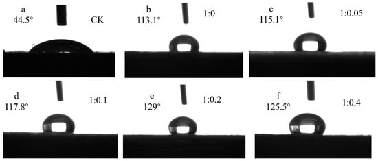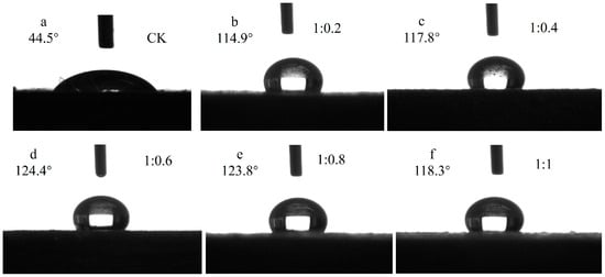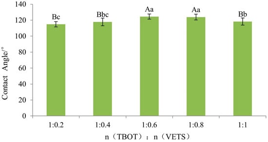Figure 9 illustrates the contact angles of Si-Ti composite films prepared with varying molar ratios of TBOT to VTES. As depicted in the figure, the modified test materials exhibited significantly increased contact angles compared to the control group, all exceeding 110°, indicating a shift from hydrophilic to hydrophobic on wood surfaces. The contact angle of silicon and titanium composite film on wood surfaces displayed an increasing trend followed by a decreasing trend as the molar ratio changed, which may be attributed to more -CH=CH2 replacing -OH on TiO2 and SiO2 particle surfaces with higher dosages of VTES resulting in increased contact angles. However, further increases in VTES dosage generated more SiO2 particles with -OH present on their surface leading to decreased contact angles. An analysis of variance (ANOVA) was conducted to investigate wettability effects between different levels of TBOT-to-VTES molar ratios for Si-Ti composite films on wood surfaces and the results are presented in Table 4.