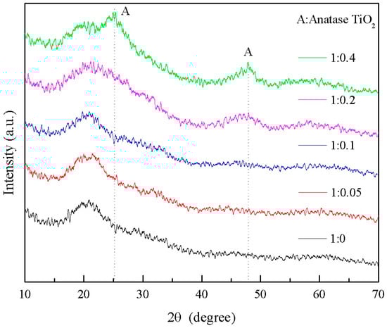 The XRD patterns of Si-Ti composite films with varying molar ratios of TBOT to EtOH are presented in Figure 3. It is evident from the figure that different molar ratios did not influence the crystallization behavior of the Si-Ti composite film on the wood surface. Notably, a broad amorphous peak corresponding to SiO2 was observed at approximately 21° (2θ angle) [], while no characteristic diffraction peaks associated with TiO2 anatase or rutile phases were detected, indicating that both SiO2 and TiO2 existed in an amorphous state within the experimental conditions.