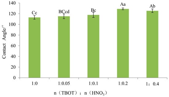 The contact angles for different molar ratios of titanate to nitric acid are presented in Figure 14. As depicted in the figure, the modified treated wood surface exhibited a significant increase in contact angle compared to the control group, indicating a transition from hydrophilic to hydrophobic behavior. With an increase in nitric acid concentration, the contact angle initially increased and then decreased, reaching its maximum value (129°) at a ratio of n(TBOT) to n(HNO3) of 1:0.2. To investigate the impact of TBOT and nitric acid at various molar ratios on the wettability of Si-Ti composite film on wood surfaces, an analysis of variance (ANOVA) was conducted and is summarized in Table 5.