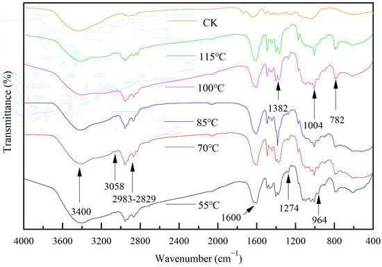 Figure 17 shows the infrared spectra of wood specimens with different drying temperatures. From the figure, it can be seen that the broad and blunt peak near 3400 cm−1 is the expansion and vibration peak of -OH, and the intensity of the vibration peak decreases with the increase in drying temperature. The 2983 cm−1–2829 cm−1 range of peaks indicate -CH3, -CH2- in the expansion and vibration of C-H peaks. The peak near 1600 cm−1 may be the telescopic vibrational peak of C=C, the peak near 3058 cm−1 may be the telescopic vibrational peak of C-H in -CH=CH2, and the peak near 1274 cm−1 may be the deformation vibrational peak of C-H in -CH=CH2. The peak near 1382 cm−1 may be the telescopic vibrational peak of -NO3. The peak near 1004 cm−1 may be the asymmetric telescopic vibrational peak of Si-O-Si, while the peak detected near 782 cm−1 may be the telescopic vibrational peak of Ti-O-Ti. Meanwhile, the peak detected near 964 cm−1 may be the vibrational peak of Ti-O-Si. With the appearance of Si-O-Si, Ti-O-Ti, and Ti-O-Si, it can be hypothesized that the surface of the wood has been loaded with TiO2 and SiO2, and bonded together with Ti-O-Si.