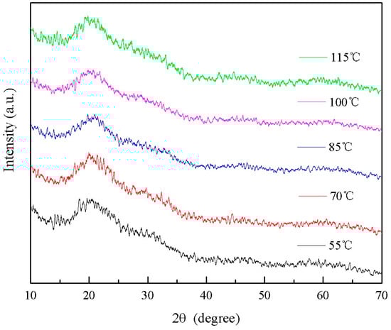 The XRD patterns of wood specimens with different drying temperatures are presented in Figure 18. Generally, achieving high crystallinity in TiO2 necessitates high-temperature calcination. However, due to the risk of carbonization or combustion and potential damage to the wood, the drying temperature can only be selected within a range suitable for wood-drying purposes. As depicted in Figure 18, variations in drying temperatures did not induce changes in the crystallization of Si-Ti composite film on the wood surface. Notably, amorphous broad peaks of SiO2 were observed near 21° [], while characteristic diffraction peaks corresponding to TiO2 anatase or rutile phases were absent. This suggests that under these experimental conditions, both SiO2 and TiO2 present in the Si-Ti composite film on the wood surface exist in an amorphous state.