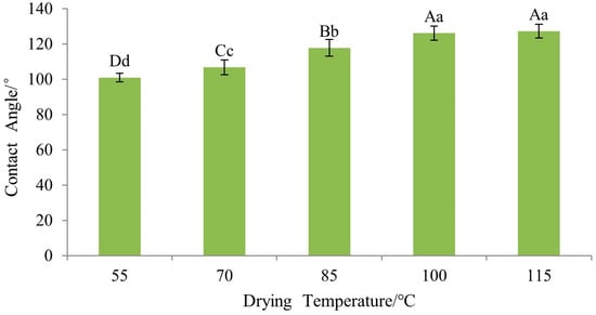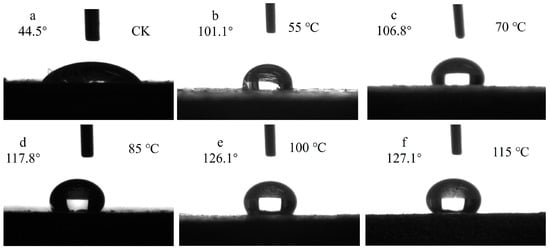 The contact angle of the silicon–titanium composite film at different drying temperatures is presented in Figure 19. As depicted, compared to the control group, the contact angle on the wood surface exhibited a significant increase, surpassing 100° and indicating a certain level of hydrophobicity achieved through wood surface modification. Moreover, it was observed that the contact angle increased with higher drying temperatures, reaching up to 127.3°. This suggests that elevated drying temperatures contribute to enhancing the hydrophobic properties of the silica–titanium composite film on wood surfaces. Based on FTIR analysis results, it can be hypothesized that a reduction in -OH groups present on the Si-Ti composite film’s surface may have contributed to its enhanced hydrophobicity.
