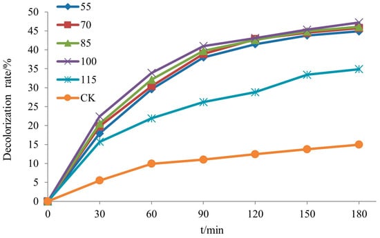 The decolorization rate of rhodamine B by the Si-Ti composite membrane at different drying temperatures is depicted in Figure 21. It can be observed that the decolorization rate slightly increased as the drying temperature rose from 55 °C to 100 °C, with values of 47.2%, 46.1%, 45.7%, and 44.9%, respectively, in ascending order. However, a significant drop occurred when the drying temperature reached 115 °C, resulting in a decolorization rate of only 34.9%. This decline could potentially be attributed to a reduction in surface -OH groups on the silica–titanium composite membrane, leading to diminished photocatalytic activity.