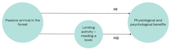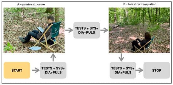 The purpose of our experiment is to compare the level of physiological and psychological benefits achieved by two variants of passive exposure to the forest (no physical activity), characterized by varying degrees of sensory activation. We decided to conduct the study among young people, because there are many studies that show that this group is most vulnerable to stress [42]. We carried out the study in spring, due to the fact that at this time of year the forest is particularly lively in terms of bird sounds, and moreover, this time of year has not often been included in studies on the effects of the forest on relaxation.