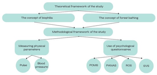 The study is expected to be a single-group, within-subjects, repeated-measures design. The theoretical location plane of the work is, on the one hand, Wilson’s Biophilia Concept [43,44], which suggests that humans have an innate tendency to connect with other life forms and nature. According to this theory, contact with nature is not only enjoyable, but essential to mental and physical health. The second theoretical concept is that of forest bathing. The term forest bathing was coined in 1982 by the Ministry of Agriculture, Forestry and Fisheries of Japan [45]. Forest therapy involves attentively communing with nature through the “experience of the five senses” (sight, smell, hearing, touch and taste) when the body is exposed to the forest environment [31,46]. Figure 2 graphically explains the methodology used to obtain information, from theoretical perspectives to methodological strategies.