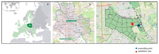 Map with the location of the test sites ((a). Poland; (b). in Warsaw; (c). in Kabaty Forest).