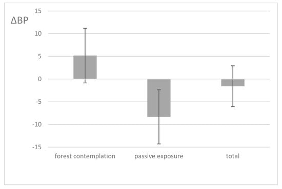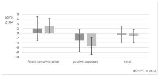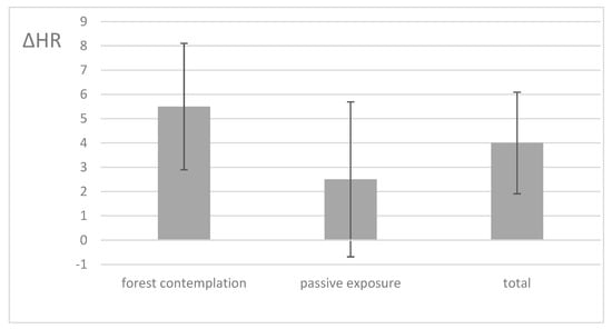 Based on statistical analysis (Figure 5) (t-test in Statistics), it was found that change in heart rate (ΔHR) was statistically significant for forest exposure and for results obtained in total for “contemplation of the forest” and “passive” exposure. An additional statistically significant, although unfavorable, phenomenon was an increase in diastolic blood pressure for “passive” exposure. This is evidenced by the clearly negative value of beneficial change in diastolic pressure (DIA). Other changes in measured physiological parameters did not prove statistically significant (Table 2).
