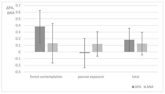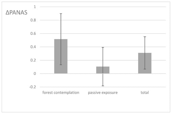 Based on the data in Table 3, the overall, cumulative affect improvement (ΔPANAS = ΔPA + ΔPN) was calculated. The average values of this overall index are shown in Figure 9. Statistically significant improvement in emotional state was observed for contemplation of the forest (ΔPANAS = 0.5 ± 0.4) and for results obtained in total for forest contemplation and “passive” exposure (ΔPANAS = 0.3 ± 0.2).