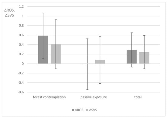 Reliability—the internal consistency coefficients for both scales, respectively ROS and SVS, established on the basis of the data obtained was 0.889 and 0.862. The average values of these benefits (∆ROS, ∆SVS) with their expanded uncertainty intervals (with a confidence level of 95%) observed for each of the two tested types of exposure are presented in Figure 10.