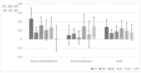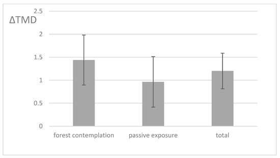 Based on the data in Table 5, the beneficial change in the total mood disturbance (ΔTMD = ΔT + ΔD + ΔA + ΔV + ΔF + ΔC) was calculated. The average values of this total index are shown in Figure 12. Statistically significant improvement in emotional state was observed for contemplation of the forest (ΔTMD = 1.5 ± 0.5), for “passive” exposure (ΔTMD = 1.0 ± 0.5) and for results obtained in total for contemplation of the forest and “passive” exposure (ΔTMD = 1.2 ± 0.4).