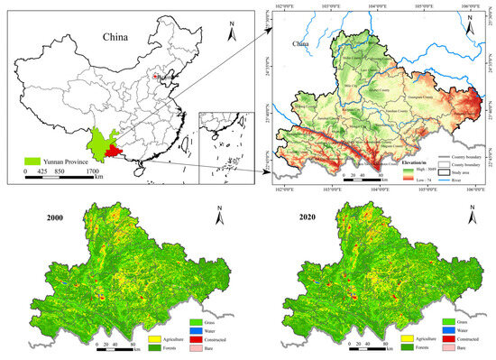 China has one of the widest distributions of Karst landscapes in the world, with Karst areas accounting for about 15% of the country’s land area [1,2]. The natural environment and climatic conditions of Karst areas make the ecosystems of the region more sensitive and less resistant to disturbance. Under these fragile ecological conditions, surface soil loss, the gradual exposure of rocks, a reduction in water retention, the interruption of vegetation growth continuity, a loss of agricultural production capacity, and the degradation of ecological environment quality have been caused by the irrational socio-economic activities of human beings over a long period of time. The Karst mountainous area in southwest China, centered on Guizhou Province [3], Yunnan Province, and Guangxi Province, is the most concentrated area of Karst distribution in China, with the largest area of exposed carbonate rocks. The area belongs to the “Southern Border Ecological Barrier” in the “Three Screens, Two Belts, Six Corridors, and Multiple Points” of Yunnan Province. However, the Karst region is a complex geographical system, and its limited natural resources, fragile ecological environment, socio-economic conditions, and tense human–land relationships have restricted the development of the region, especially in recent years. The contradiction between production space and ecological space has been prominent, and there is a scarcity of space for multi-functionality. The constraints on production space resources have been tightening. Therefore, an in-depth study of the spatial and temporal evolution of ecosystem services and its driving factors in the region is of significance for achieving regional ecological protection and sustainable development.