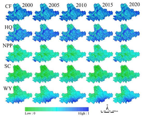 Spatial distribution map of ecosystem services in the study area from 2000 to 2020.