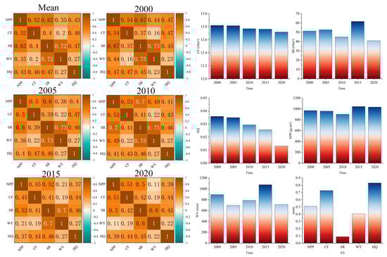 It is worth noting that the synergistic relationship between the five categories of ecosystem services remained relatively stable from 2000 to 2010 (Figure 5), but the synergistic relationship between water yield and net primary productivity declined significantly between 2015 and 2020. The correlation coefficient for this relationship was 0.49 in 2010, while in 2020 this value dropped to 0.11. This change may have been related to regional climate change, increased human activities, and the implementation of ecological restoration measures in recent years. In particular, changes in precipitation patterns as a result of climate change may affect the allocation and use of water resources, which in turn affect the growth of vegetation and the productivity of ecosystems.