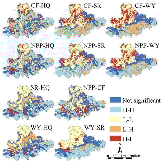 Bivariate spatial autocorrelation analyses using Geoda2.1 software revealed complex spatial correlations among the five types of ecosystem services in the Yunnan Karst region (Figure 6). The results of the analyses showed that these ecosystem services had the spatial characteristics of low–low clustering in the northern part of the region, which indicated that the level of ecosystem service provision was generally lower in the more economically developed areas with relatively flat land and a higher intensity of human activities. This could be attributed to the high pressure of highly urbanized and industrialized activities on the natural environment, leading to a decline in ecosystem service capacity. Further analyses showed that carbon fixation (CF) and habitat quality (HQ) exhibited low–low and high–low clustering in the northern part of the study area, but high–high clustering in the central and southern parts. This distribution pattern reflected the interactions and dependence between ecosystem services in different regions. The low–low clustering in the north may have reflected the reduced capacity of ecosystem services due to intensive human activities, while the high–high clustering in the center and south may have been related to the lower intensity of human activities and better natural environmental protection status in these areas. In addition, CF showed similarities in spatial agglomeration type to soil conservation (SR) and water yield (WY), suggesting a high synergistic service relationship between WY and SR. This synergy may have been due to the fact that all these services are closely related to water resources and soil conditions, and good water management and soil conservation measures can simultaneously enhance the carbon fixation capacity of these regions. Habitat quality (HQ) and net primary productivity (NPP) showed high–high clustering in most of the study area, indicating that these two services tend to be simultaneously high in ecologically well-conditioned areas. The clustering space of NPP with SR and WY was mostly low–low clustering, which was similar to the type of clustering of CF and SR and WY, further proving the clustering tendency of these services in areas that have been less affected by human activities.