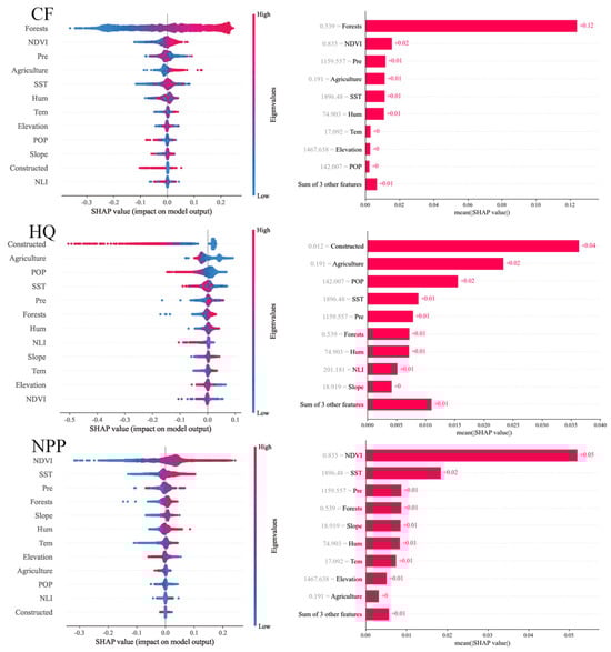 The key drivers of the carbon fixation capacity included the proportion of forest land, the vegetation index (NDVI), rainfall (Pre), the proportion of agricultural land (Agriculture), and sunshine hours (SST). The highest SHAP value (0.12), for the proportion of forested land, indicated that forested land was the most critical factor for regional carbon fixation, reflecting the central role of forest ecosystems in carbon sequestration. The SHAP value of 0.02 for the NDVI was the next highest, revealing the significant influence of vegetation health on the carbon fixation process. The SHAP values of rainfall and sunshine duration were both 0.01, revealing the fundamental supportive roles of moisture and sunlight on plant growth and carbon fixation activities. The influencing factors of habitat quality included the proportion of construction land (Constructed), the proportion of agricultural land, population density (POP), sunshine duration, and rainfall. The SHAP value of 0.04 for the proportion of construction land was the most important factor affecting habitat quality, highlighting the potential destructive effects of the expansion of construction land on natural habitats in the process of urbanization. The SHAP value for agricultural land was 0.02, further emphasizing the impact of land use change on biodiversity and ecological quality. The SHAP values of population density and sunshine duration were both 0.01, jointly indicating the intensity of human activities and environmental conditions.