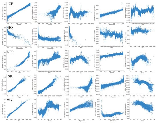 Average SHAP values and factor importance rankings in the study area shape the habitat pattern. The main influencing factors of NPP were the NDVI, sunshine duration, rainfall, proportion of forested land, and slope. The SHAP value of the NDVI was the highest (0.05), which indicated that the vegetation cover and health were the key factors determining the NPP, and emphasizing the direct influence of vegetation on the productivity of ecosystems. Sunshine duration (SHAP value of 0.02) and rainfall (SHAP value of 0.01) indicated the direct influence of climatic factors on vegetation growth and ecological productivity. The main factors affecting soil retention were slope, rainfall, the NDVI, percentage of forested land, and temperature (Tem). Slope, with a SHAP value of 0.03, was the most important topographic factor affecting soil retention, pointing to the potential risk of steep topography to soil erosion. Rainfall had a SHAP value of 0.02, emphasizing the dual role of precipitation in soil erosion and conservation. Water yield was influenced by rainfall, humidity (Hum), agricultural land share, sunshine hours, and elevation. Rainfall had the highest SHAP value (0.09), showing the dominance of rainfall in determining regional water availability. The SHAP values of 0.01 for both humidity and elevation further illustrated the influence of climatic and topographic conditions on the water resource distribution.