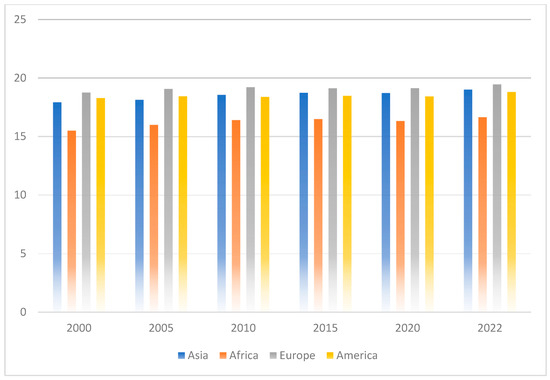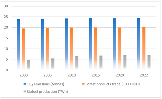 Bioenergy is another factor that is considered by this analysis as a potential determinant of environmental quality [22]. With the growth in renewable energy, the significance of bioenergy is also increasing due to its low-carbon characteristics. Replenishment is one of the main qualities of bioenergy and other renewable energy sources. Since the start of this world, renewable energy sources (e.g., solar, wind, hydel, and biofuels) have been available as the primary sources. Energy generation from these sources results from natural courses that occur repeatedly over our lifetimes [23]. Therefore, renewable energy sources are widely believed to be unlimited sources of energy. Bioenergy is an important source of low-carbon energy generated by firing wood, which has been due to the growing significance of bioenergy, policymakers are now shifting their focus to the increased production of bioenergy as a component of their energy transition strategy [24]. There are three main motives behind their efforts to expand bioenergy production. First, to reduce the reliance on energy sources based on fossil fuel production. Second, a balance between bioenergy production and the chances of lowering carbon emissions can be achieved by limiting coal and lignite consumption. Thirdly, promoting rural development may significantly boost the rural economy [25]. The global CO₂ emissions have risen slightly from 2000 to 2022. The trade of forest products has also increased, while biofuel production has shown steady growth (Figure 1). In 2022, Figure 1 records the highest levels: CO2 emissions at 24.34 tonnes, FPT at USD 20.27 thousand, and biofuel production at 7.08 TWh. Figure 2 shows a gradual increase in the trade values for Asia, Africa, Europe, and America regions. The highest FPT values are recorded in 2022. These are recorded as follows: Asia with USD 19.01 thousand, Africa with USD 16.65 thousand, Europe with USD 19.45 thousand, and America with USD 18.80 thousand. Over the years, biofuel production has significantly increased in America and Europe, with America leading at 749.91 TWh in 2022 (Figure 3).