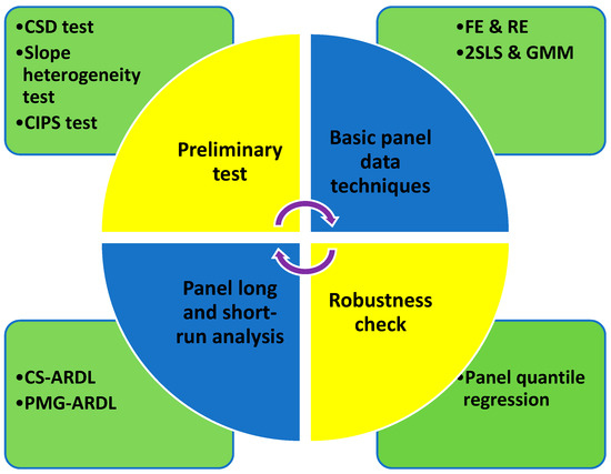 where is the vector of independent variables. To enhance robustness, we used the pooled mean group-ARDL (PMG-ARDL) method [81]. This approach mitigates the autocorrelation problem and simultaneously provides short- and long-term effects. Additionally, the study also employs the panel quantile regression method. This method accounts for the entire distribution while addressing time-varying issues of heterogeneity and outliers. The analysis flowchart is shown in Figure 4.