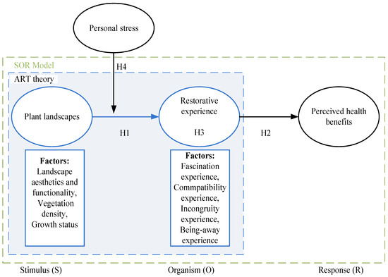 This research adopted stimulus–organism–response theory (SOR theory) and attention restoration theory to determine the health benefit responses to plant landscapes in green spaces. Specifically, we aimed to (1) explore the relationships among the plant landscape, restorative experience, and residents’ perceived health benefits; (2) verify the mediating effects of experience on the relationship between the plant landscape and perceived health benefits; and (3) examine whether stress moderates the mediating effects of restorative experience on the relationship between the plant landscape and perceived health benefits.
