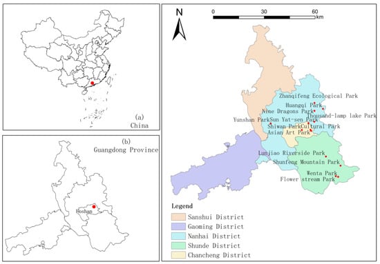 Foshan is in the hinterland of the Pearl River Delta in the central part of Guangdong Province and is an important node city in the Guangdong Hong Kong Macao Greater Bay Area, China (Figure 2). Not only is Foshan an advanced manufacturing base in China and a national historical and cultural city, but it also holds the title of a “forest city”, as of 5 January 2024, China has built a total of 219 national forest cities. The main criteria for the selection of forest cities are as follows: 1) The green coverage rate of urban areas is ≥40%, the per capita park green area in urban areas is more than 11 square meters, the street tree crown coverage rate in urban areas is more than 25%, and the arbor tree crown coverage rate in urban ground parking lots is more than 30%. 2) The greening rate of waterfronts is ≥80%, the greening rate of green channel lines is ≥80%, and the proportion of native tree species in urban greening tree species is ≥80%. 3) There are many leisure green spaces in the built-up areas, mainly consisting of various parks and public green spaces. Most citizens have access to leisure green spaces within an average of 500 meters of their homes. In the past five years, the city has built 833.36 hectares of new park green space, renovated 526.05 hectares of park green space, and built over 30 large parks (with a total area of more than 100,000 square meters). Under the guidance of the State Forestry Administration and the planning and construction of local governments, the green coverage rate in the built-up area of Foshan increased from 40.98% to 46.12%, and the per capita park green space increased from 14.67 square meters to 19.2 square meters. Therefore, Foshan ranks ninth in the ranking of urban greening in China. An increase in green space area and storage plays an important role in alleviating air pollution, improving quality of living, and promoting sustainable economic and social development in Foshan city. This study selected representative urban green spaces such as Asian Art Park, Sun Yat-sen Park, Thousand-Lamp Lake Park, and Cultural Park in the urban area of Foshan city with high pedestrian flow, large areas, and well-equipped facilities as case studies on the basis of online recommendations. These urban green spaces are all located in central urban areas with convenient transportation, high reachability for residents, and good plant landscape environments. They are appropriate cases for studying green space and the restoration experiences of individuals seeking recreation.