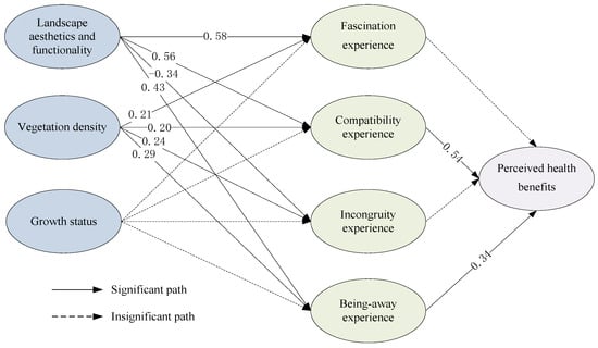 To improve efficiency and consider the results of the data fit of the structural equation analysis, we tested only the mediating effect of four causal chains: vegetation density → compatibility experience → perceived health benefits, vegetation density → being-away experience → perceived health benefits, landscape esthetics and functionality → compatibility experience → perceived health benefits, and landscape esthetics and functionality → being-away experience → perceived health benefits. The results suggest a significant indirect effect of vegetation density through compatibility experience on perceived health benefits (β = 0.21, 95% CI [0.14, 0.36]); vegetation density through being-away experience on perceived health benefits (β = 0.17, 95% CI [0.10, 0.27]); landscape esthetics and functionality through compatibility experience on perceived health benefits (β = 0.30, 95% CI [0.21, 0.41]); and landscape esthetics and functionality through being-away experience on perceived health benefits (β = 0.21, 95% CI [0.12, 0.32]; Table 3). Hypothesis H3 was partly supported.